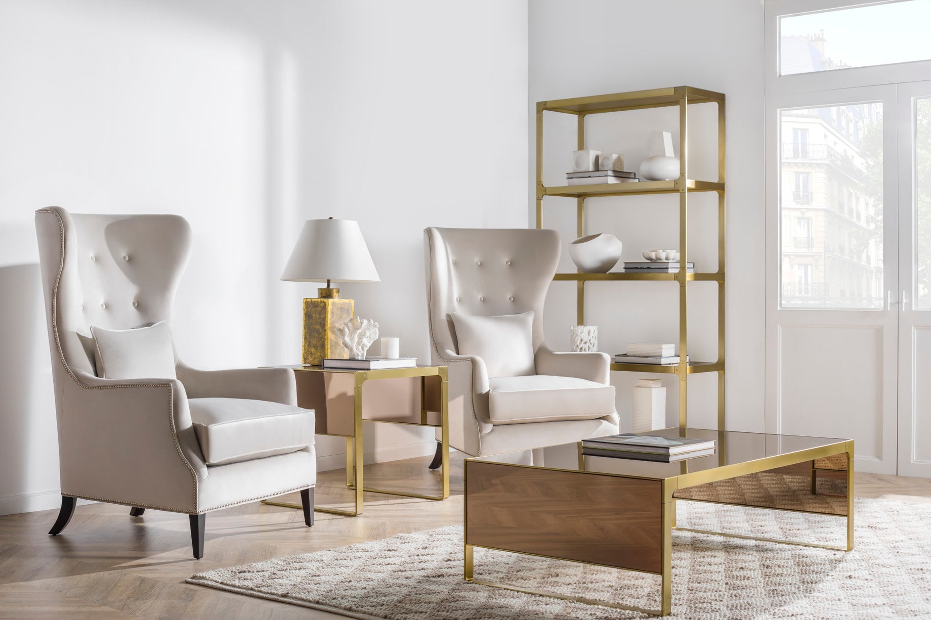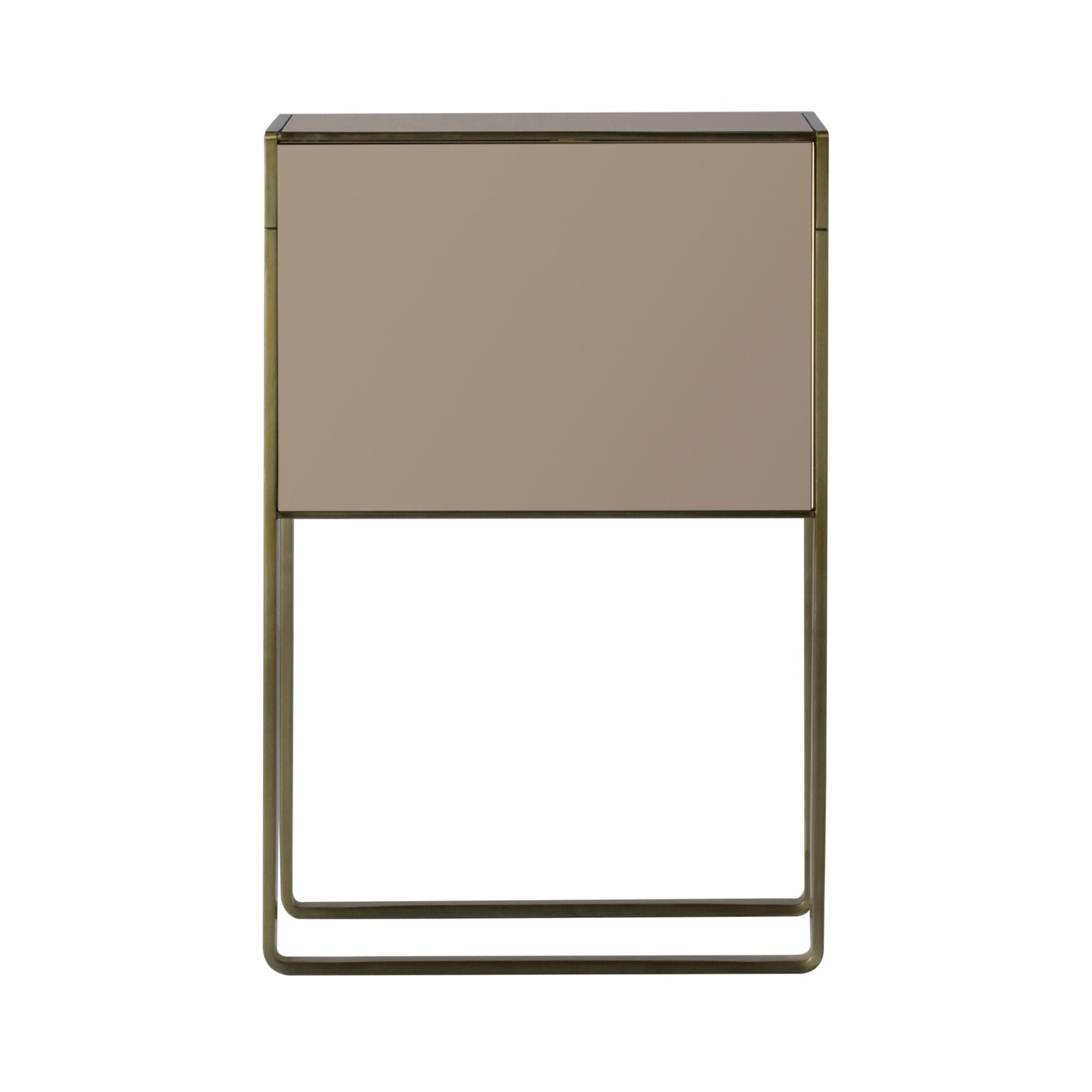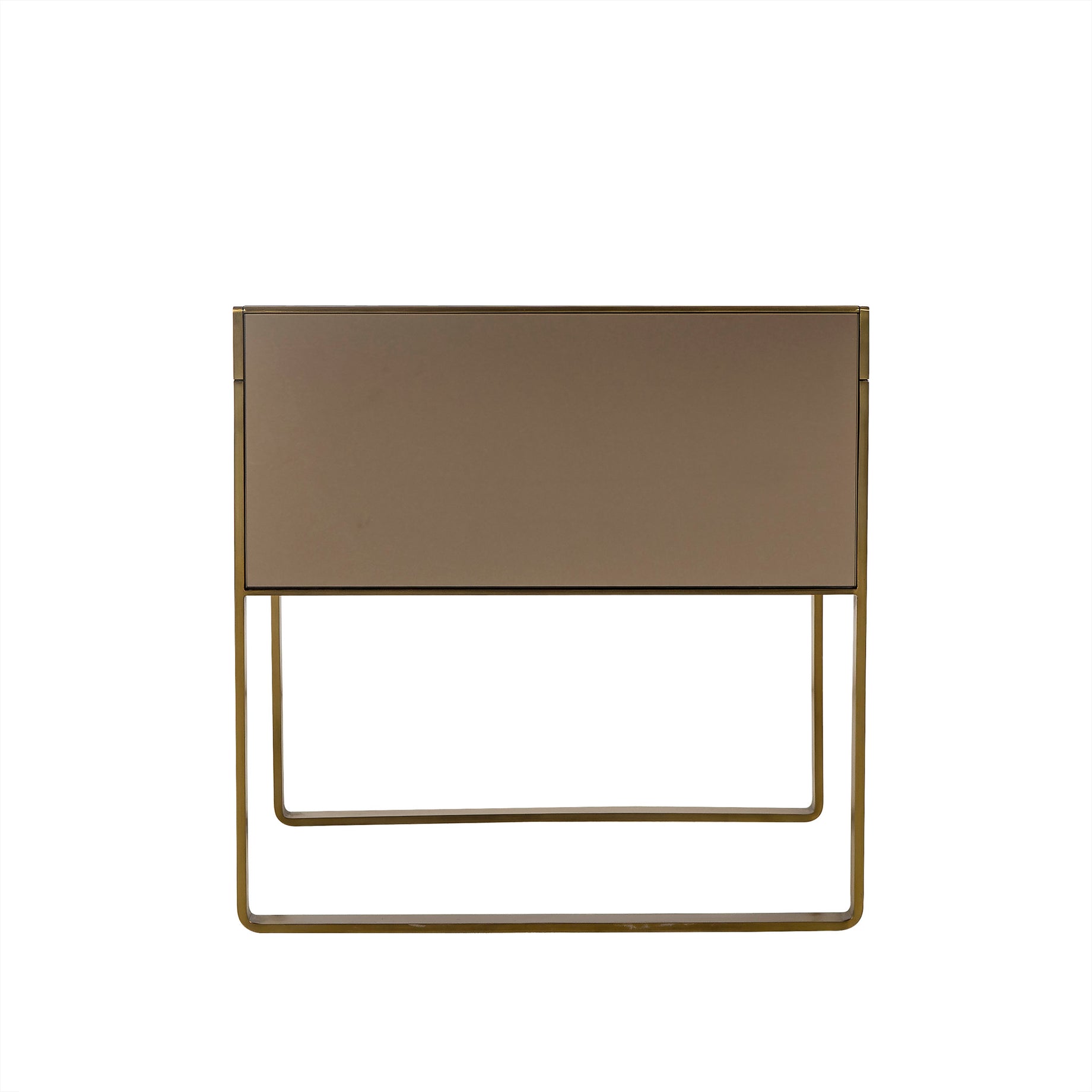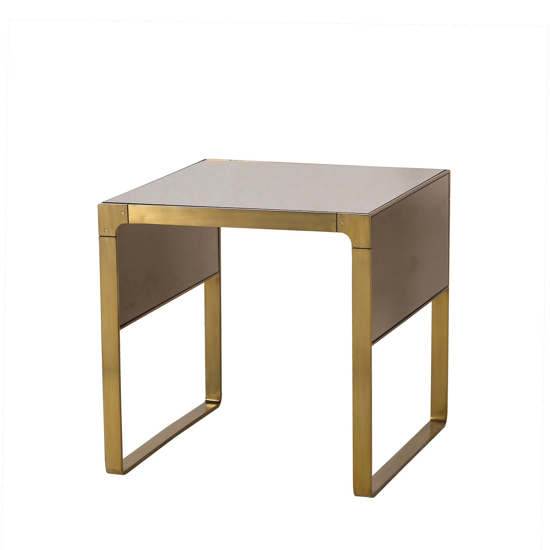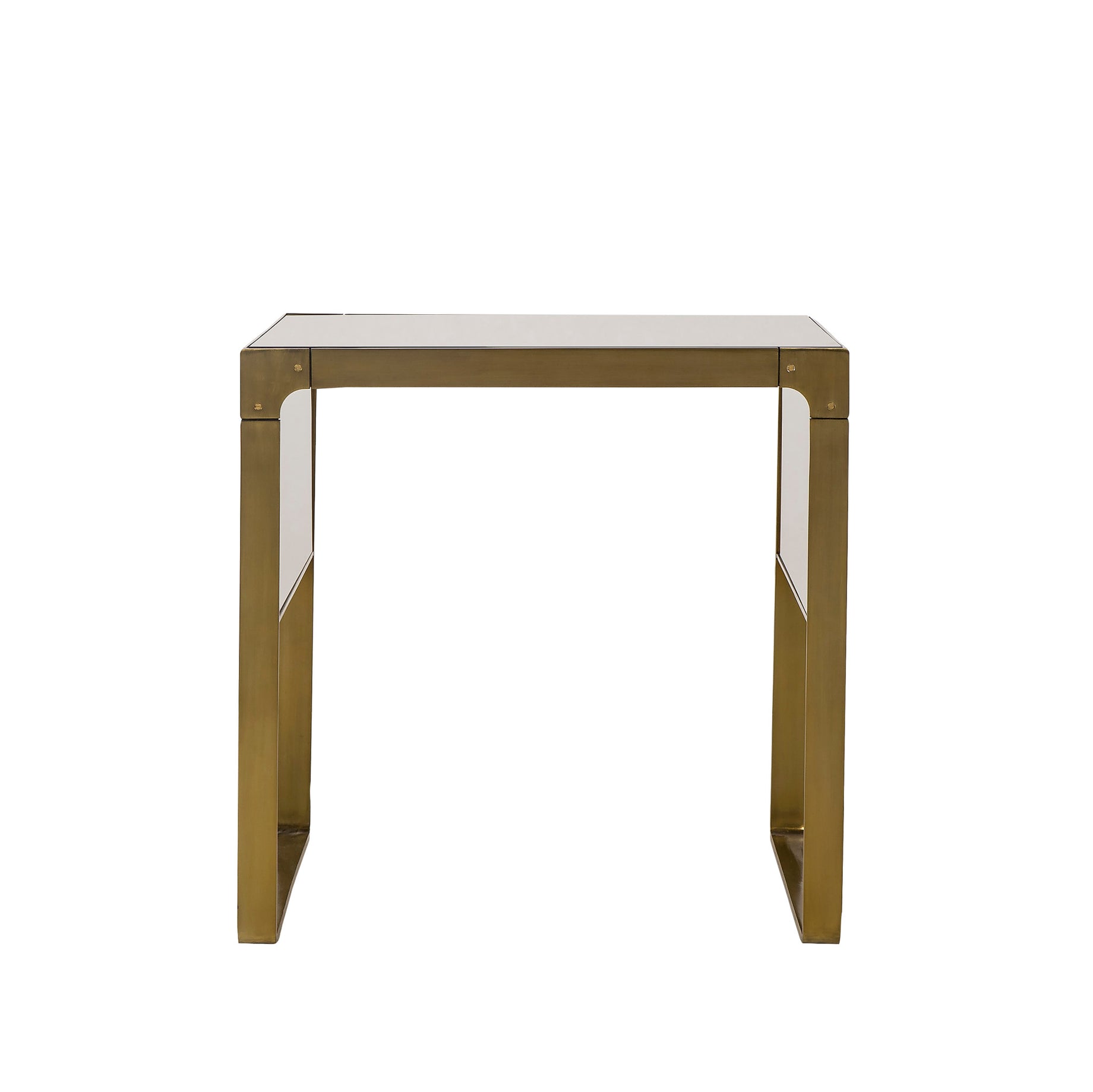A contemporary, stainless steel side table, finished in satin brass, with a bronze glass top and sides conveys relaxed glamor.