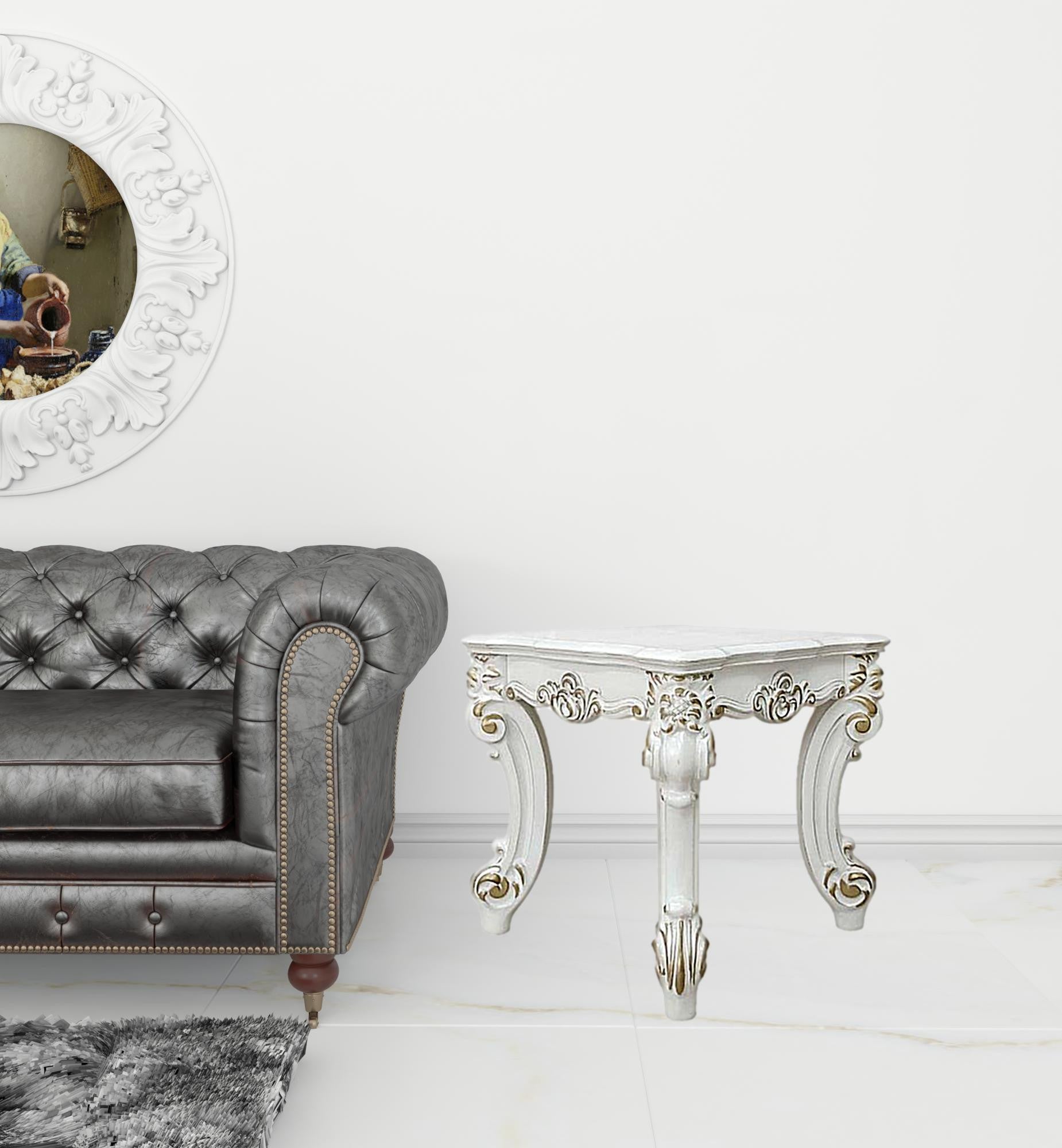 Show off your exquisite taste with this 26" antique pearl manufactured wood square end table. This table is made from manufactured wood in a antique pearl color throughout the base and top. An ideal location for placing your snacks and drinks, and a place to keep your lamp, frames, or other accessories. You can also use it as an entryway table to hold your keys. 26" H x 26" W x 26" D